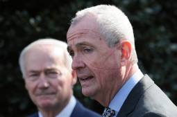 New Jersey Gov. Phil Murphy (right) and Arkansas Gov. Asa Hutchinson speak outside the White House after a meeting with President Joe Biden and members of the National Governors Association on Jan. 31. (Win McNamee / Getty Images)